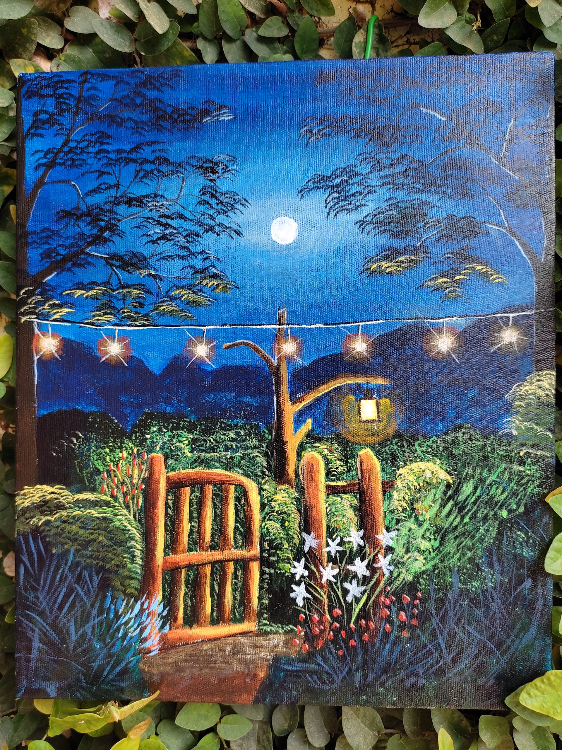 “Gate of Happiness” by Asif Tonmoy, a serene acrylic painting on a 10/12 inch canvas, depicts a moonlit garden with a charming gate. Perfect for bedrooms or living rooms!
