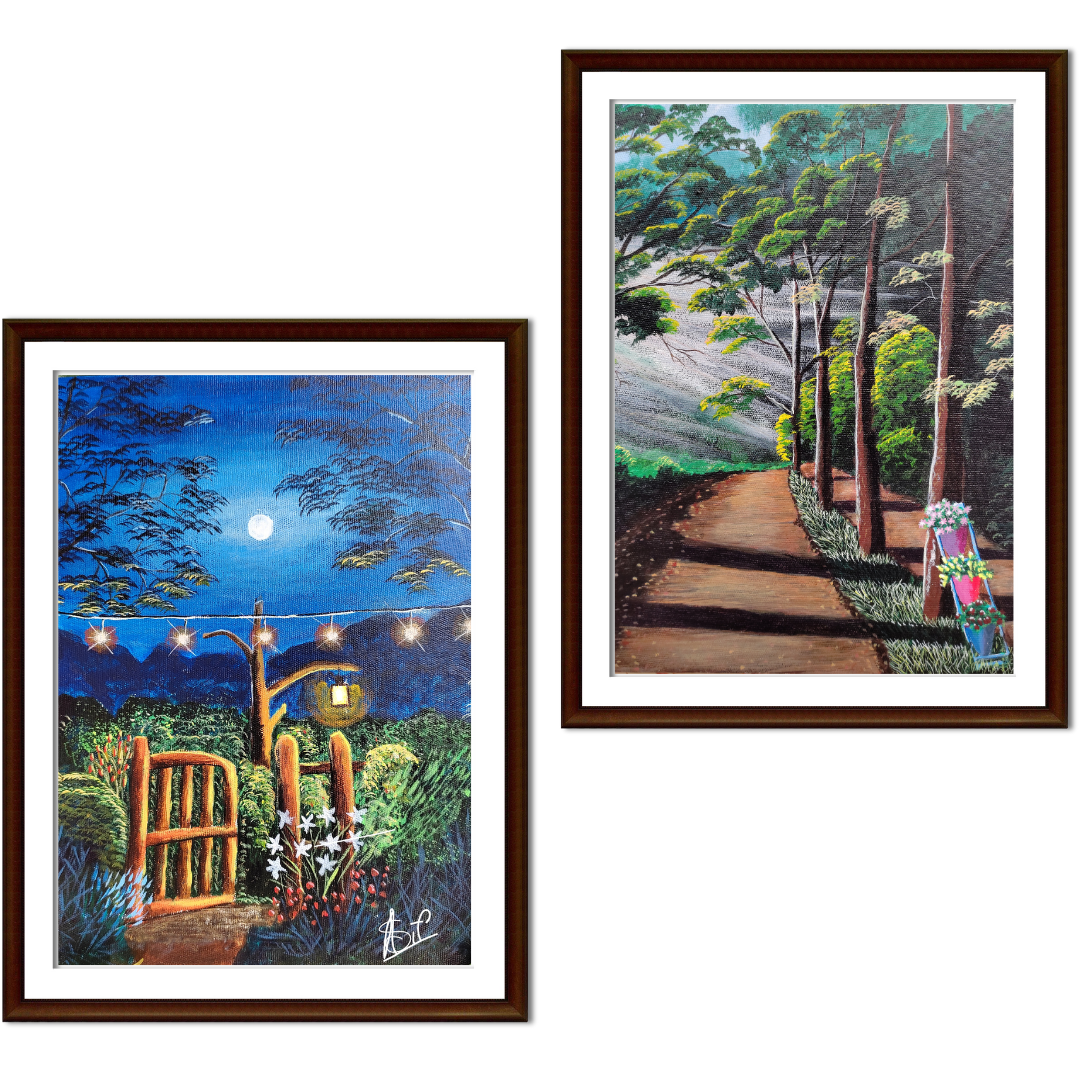 The first painting invites you to a moonlit garden, where a rustic gate leads to a mysterious, enchanting landscape. The second painting transports you to a lush forest path, bathed in the warm glow of the setting sun.